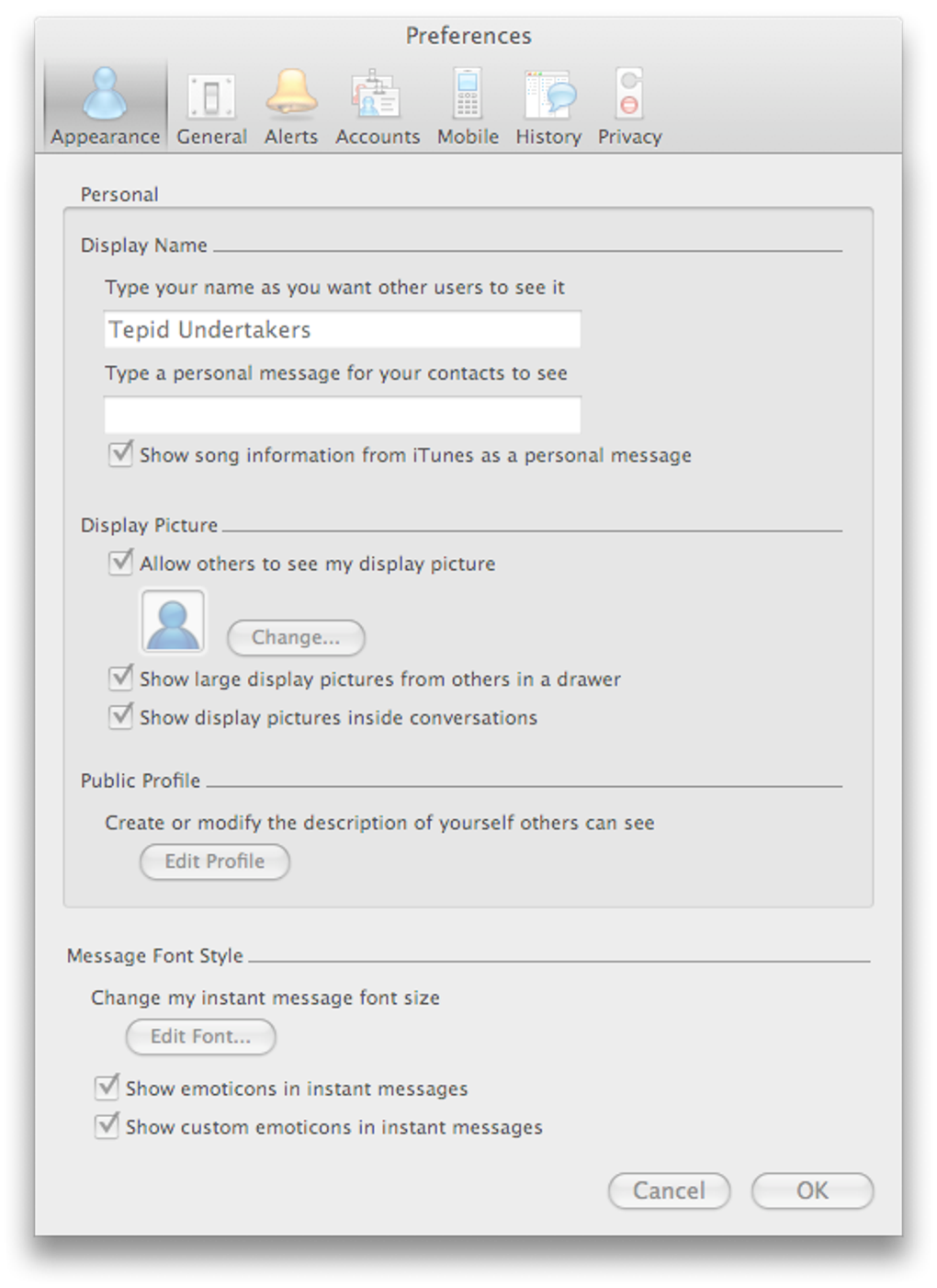 Messenger 7 offre Bonjour suppor t, quindi è possibile rilevare e connettersi con gli utenti sulla stessa rete locale dell'utente. Funzioni come l' invio di file, la visualizzazione di una foto o di emoticon sono invariate. È possibile modificare il nome visualizzato e aggiungere un messaggio personale semplicemente facendo clic su di essi.